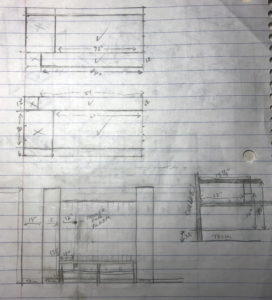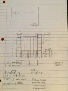 In the middle of the sketch, you’ll see the preliminary drawing for the whole unit. We talked through how many shelves we wanted, how tall and deep they should be, and the height and depth for the bench seating. The way we decided on the bench dimensions was to sit on chairs of different heights while we tested taking our shoes off and putting them on to see what was most comfortable for us. If you decide to build something like this, you may want to check heights (and depths) of your bench to be optimal for you and your family. However, that being said, I think our measurements should work fine for most people.